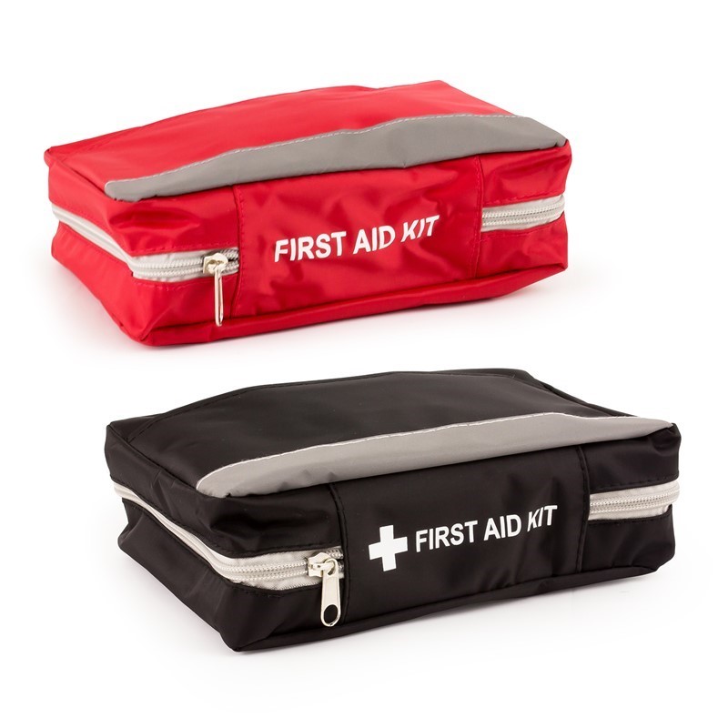 This First Aid Kits kit provides essential First Aid Kits supplies for all activities, packed in a heavy duty bag with reflective strip and external pocket, inside has multiple compartments and black mesh zipper pockets. OSH compliant. Contents: 1 x triangular bandages, 4 x adhesive bandages H shape, 5 x adhesive bandage, 1 x conforming bandage, 1 x thick PBT bandage, 1 x paper tape, 1 x adhesive strip, 4 x non woven sponge, 1 x mouth to mouth mask, 3 x cleansing wipes, 3 x soap wipes, 6 x safety pins, 1 x scissors, 1 x tweezers, 1 x safety gloves, 1 x emergency blanket, 1 x First Aid Kits information.