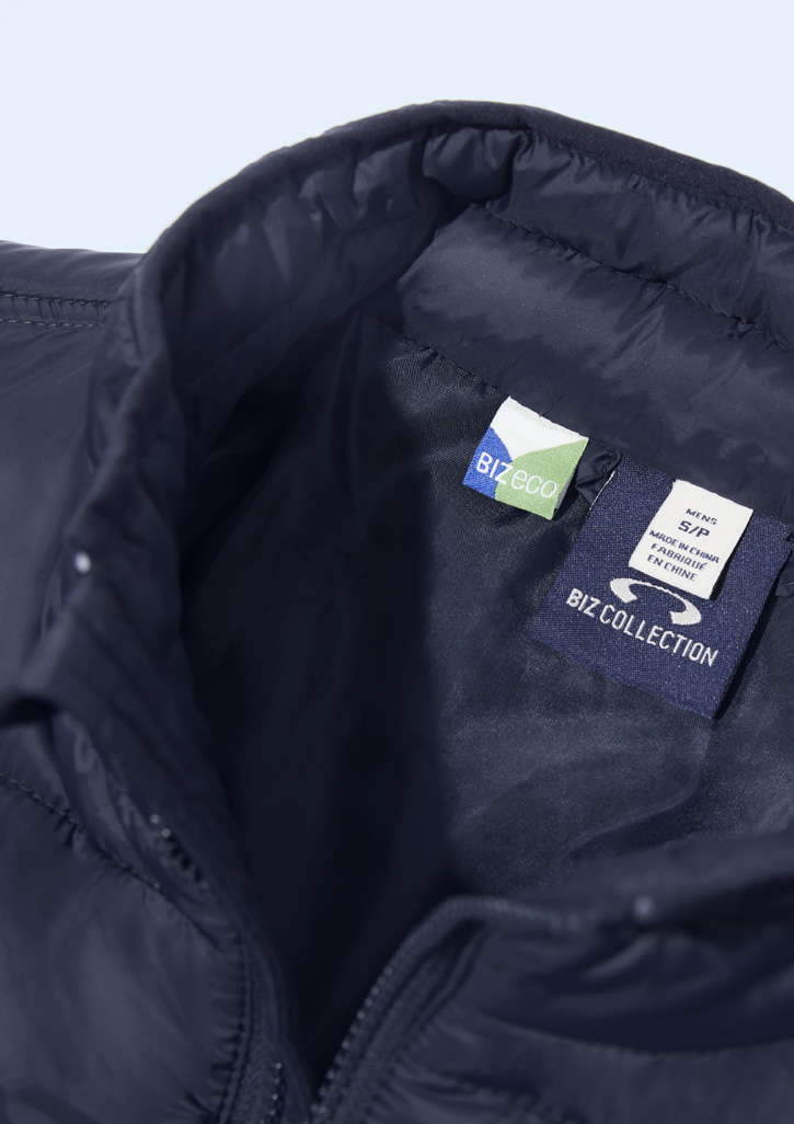 Fabric:– Outer Shell: Showerproof, 100% Nylon.– Lining: 100% Polyester.– Biz Eco Insulation: 100% Certified Recycled PET Polyester.Features:– Responsibly made using recycled PET insulation– Lightweight, comfortable showerproof outer– Plain non-quilted yoke area for easy, clear decoration– Stand up wind collar with soft knit bound edge and chin guard– Full zip front and zip pockets with rubberized ergonomic toggles– Hip length, with longer back tail for added warmth– Embroidery access zip– STYLE TIP: Customize your look by adding our J744 colored zippers to match your brand