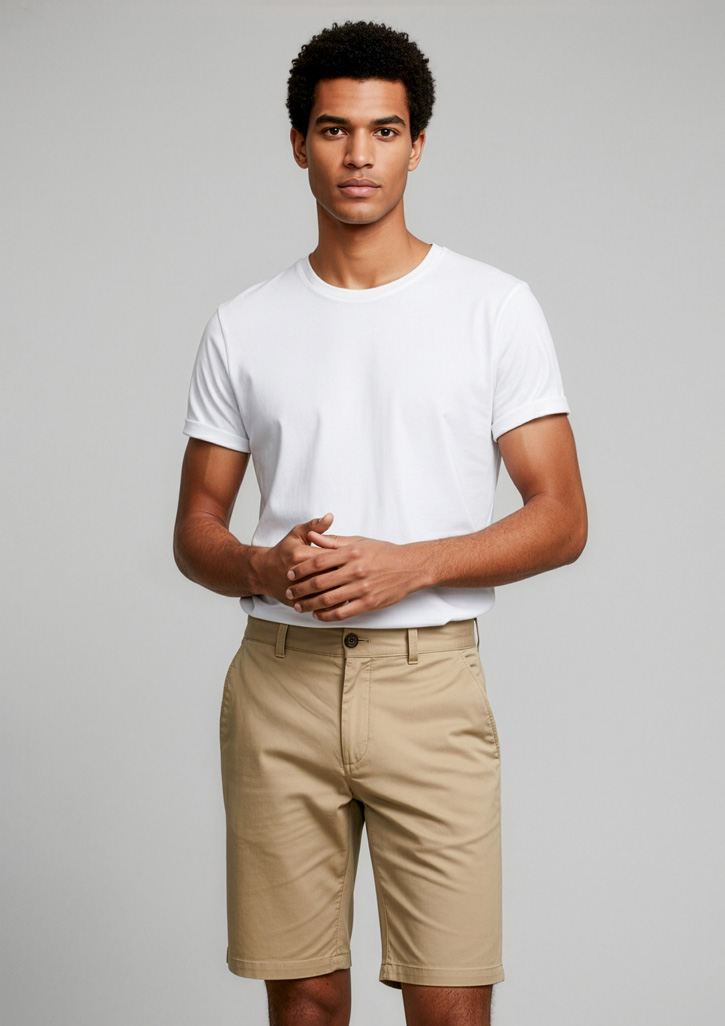 Fabric:– 98% Cotton, 2% Elastane Stretch Fabric– 240 GSMFeatures:– Garment washed for a soft lived-in feel– Comfortable modern midrise fit– Flat front with 2 side angled pockets, 2 back welt pockets