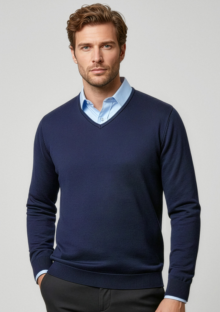 Fabric:– 50% Pre-Shrunk Wool, 50% Acrylic – 12 Gauge– Machine washable on wool settingFeatures:– Contemporary V-neck style features ribbed side panel detail