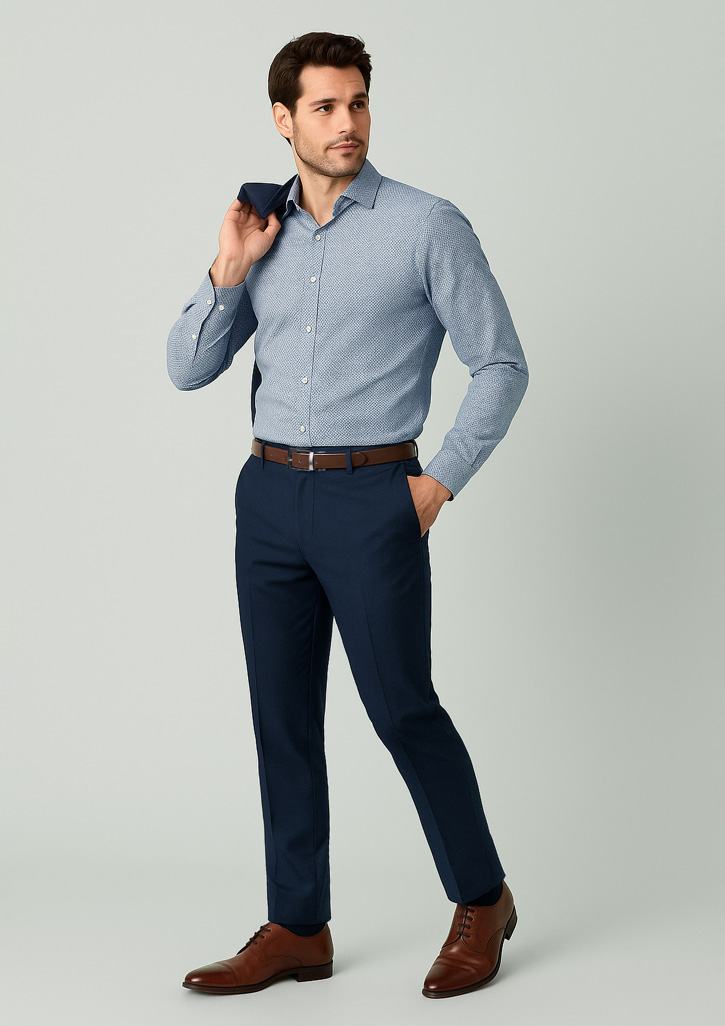 Fabric:Features:– Slim fit– Pressed creases– 2 Angled front side pockets– Zip closure with extended button tab– 6 Belt loops allowing belt to sit comfortably at waist– Waistband with inbuilt internal shirt grips– 5cm Hem allowance for easy alterations