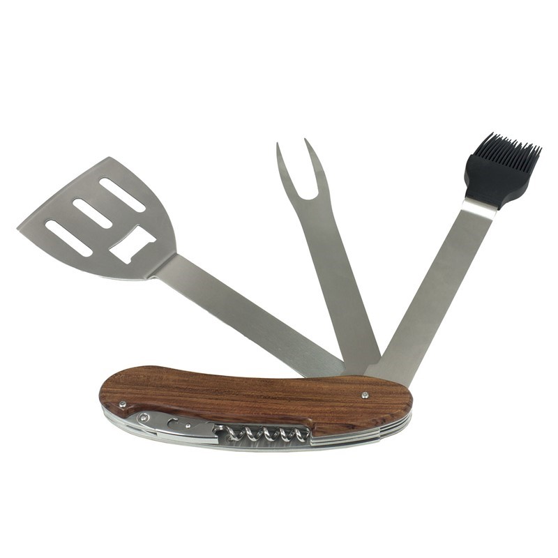 Everything the grill master needs in one innovative tool; fork, spatula, silicone marinade brush, bottle opener and corkscrew. This rosewood handled tool divides into 2 parts when using then folds back into the handle and locks together for easy carrying making BBQ activities more fun, easy and convenient. Packed in a 2 piece matt black gift box.