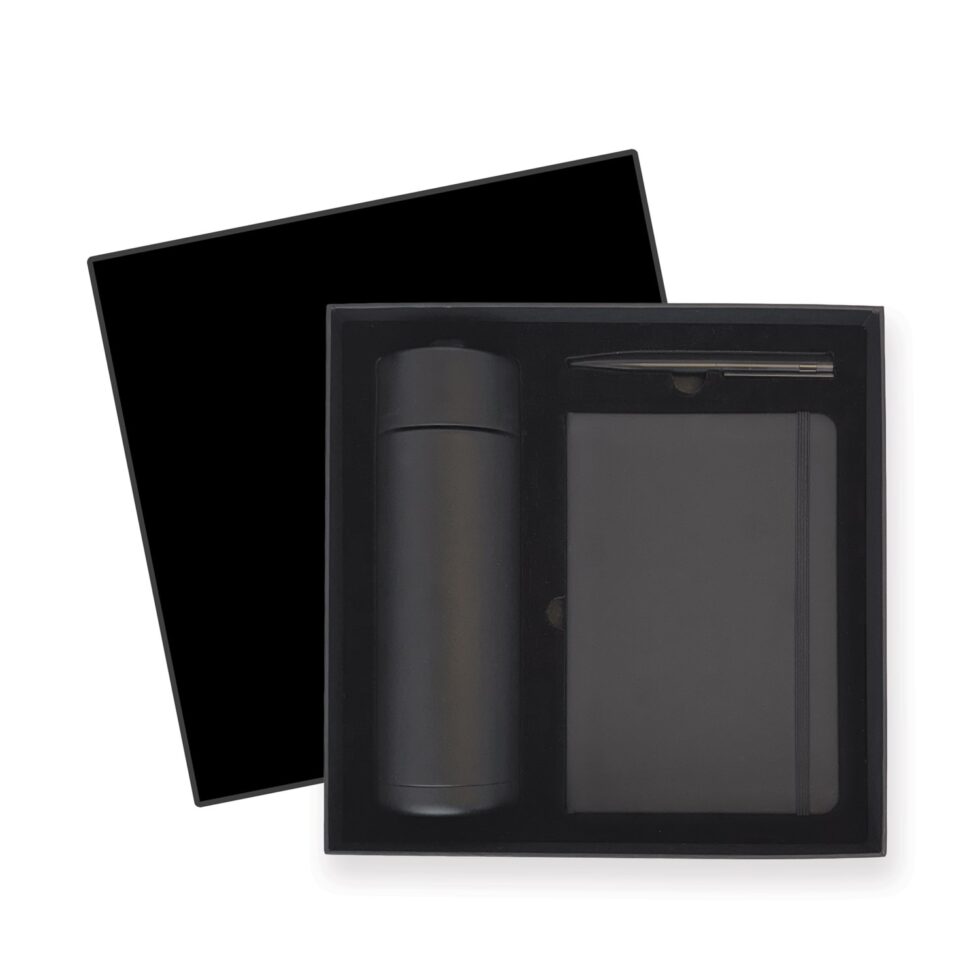 The Obsidian Gift Box Set is the ideal gift. Designed to impress, it includes Maxum’s Aquafy 700ml Bottle, Pacific A5 Notebook, and the Vermont Pen. All perfectly contained in a premium gift box crafted from 150g black card, mounted on a 1200g single-sided black and grey board, giving it a premium look and sturdy feel.