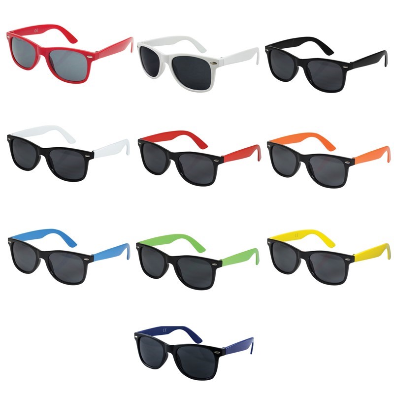 Classic wayfarer style sunglasses available in black, or two tone black and bright colour frame with silver accents and UV400 sun protection.