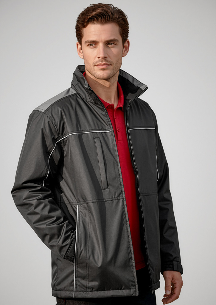Fabric:– Outer: 100% Polyester with Reflective piping– Lining: 100% Polyester Poly Fleece with TaffetaFeatures:– High wind collar with concealed hood and adjustable drawstrings– 2 Concealed zippered front pockets– Right vertical zippered chest pocket and quick-close tape fastener inside left breast pocket– Elasticated adjustable sleeve cuffs– Inside zip access for embroidery– STYLE TIP: Customize your look by adding our J744 colored zippers to match your brand