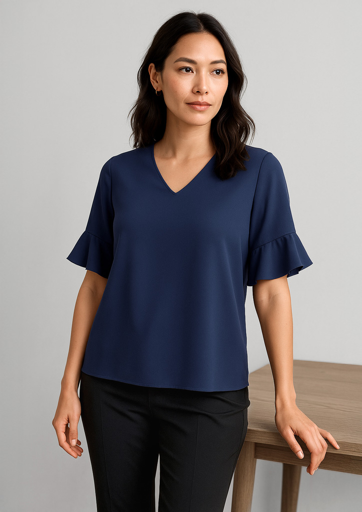Fabric:– 100% Polyester.– Machine wash in garment bag on gentle cycle, with little to no pressing required.Features:– On trend styling made from a luxurious lightweight breezy Georgette fabric with a beautiful surface texture and soft drape.– Easy slip on style top with soft fluted sleeves. Straight hem cut, wear trucked in or out.