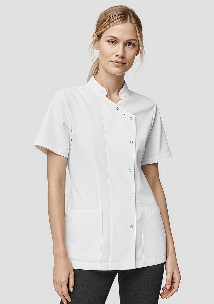 Fabric:Features:– Classic fit– Asymmetrical front with ring-snap fastener closure– 2 Front pockets on each side– Mandarin collar with open neckline– Darts on the back to add more shaping to body– Bar tacked reinforcement on pockets and splitsProduct Care: