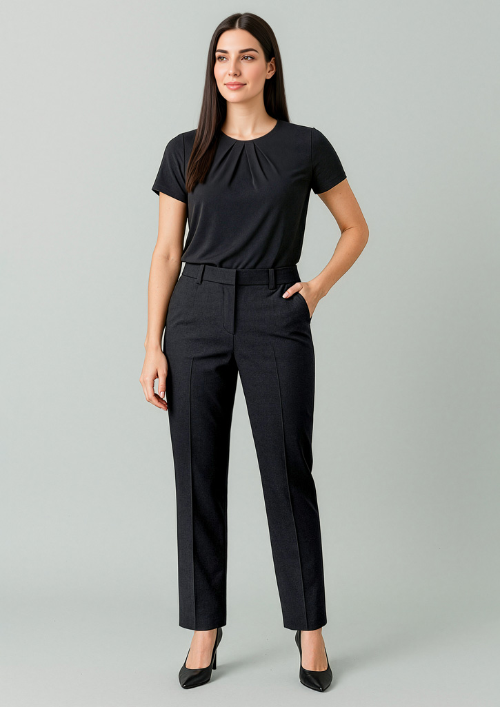 Fabric:Features:– 6 Belt loops– Sits mid waist– 2 Deep side pockets, mock back welt– 5cm Hem allowance– Hidden side elastic waist band to provide an extra 1/2 size when stretched out– Slight tapering of pant from knee down
