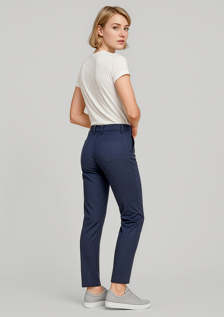 Fabric:– Main: 97% Cotton 3% Elastane, Trims: 100% Cotton Chambray.– Soft peached hand feel.– Wash before wearing, machine wash cold, inside out with like colours.– Do not bleach, hang to dry in shade.– Can be tumble dried on low.– Cool iron.– Dry cleanable (P).Features:– Designed to sit mid-waist, with a close fit through the thigh and leg with a narrow leg opening.– Features 2 back pockets, 2 angled pockets and shaped back rise for a tailored fit through the hips and waist.– Fabric has added stretch for comfort and easy movement.