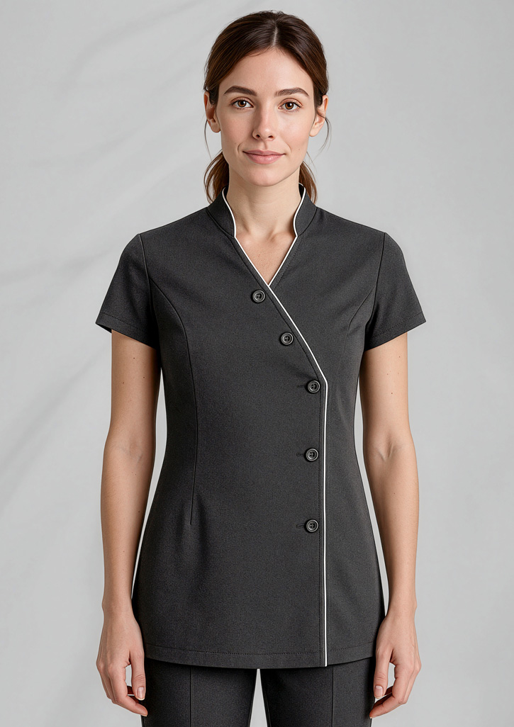 Fabric:– 97% Polyester, 3% Elastane– New Teflon® stain release stretch fabric– 230 GSMFeatures:– Semi-fitted button through wrap over styling– “V” Shaped neck with mandarin collar– Longer line with deep side splits